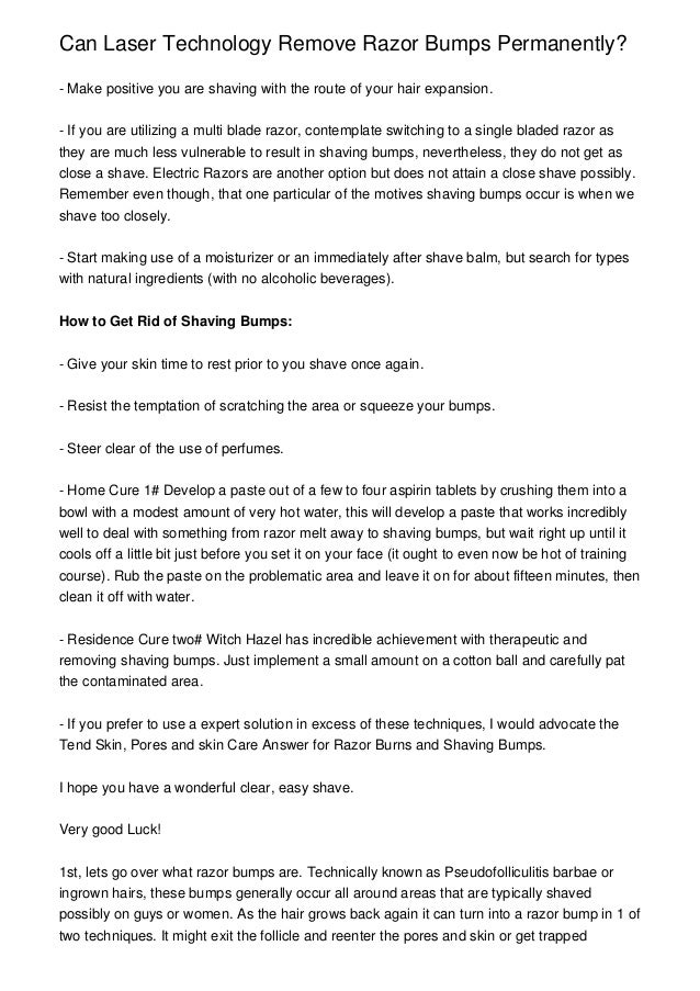 Dermatologists use light beams to destroy hair follicles, which is the source of hair growth. The best way to avoid razor bumps is to opt for an alternate hair removal method. If you've tried anything and still can't avoid developing bumps, it might be time for a more permanent solution: The best method for permanent result is laser treatments. Laser hair removal is the safest method to get rid of unwanted hair with lasting results. Tend skin ® solution reduces the appearance of ingrown hair, razor bumps, and redness from shaving, waxing, electrolysis or laser hair removal. Laser hair removal uses thermal energy to destroy hair that is in the follicles at the time of treatment. If you've been considering ditching razors and wax in favor of electrolysis or laser hair removal, we don't blame you — the allure of going bare without the constant upkeep is real. Laser hair removal + bumps. As you progress through your laser hair removal program, you will notice the razor bumps and pseudofolliculitis slowly fade and disappear. This procedure uses a concentrated beam of light (laser) to target and eliminate hair follicles. After a series of laser treatments, you will have clean, healthy, smooth skin. However, certain techniques can irritate the skin, potentially causing razor bumps.